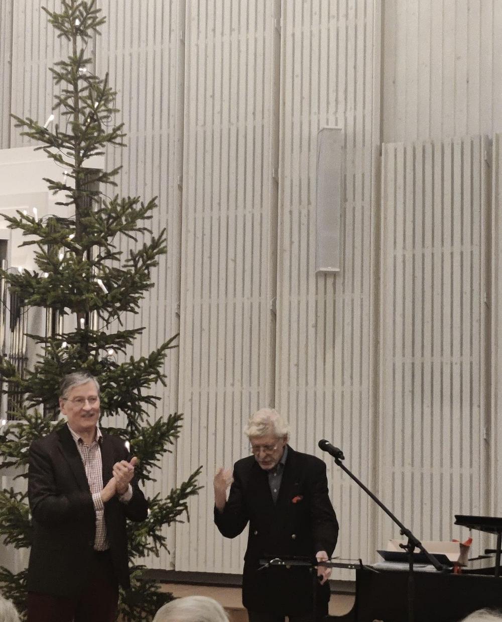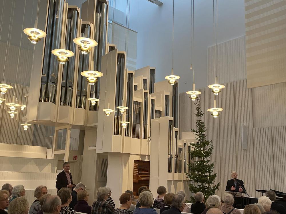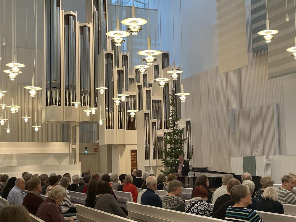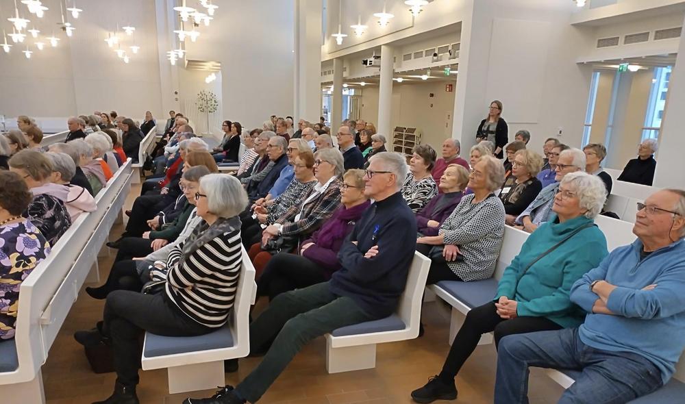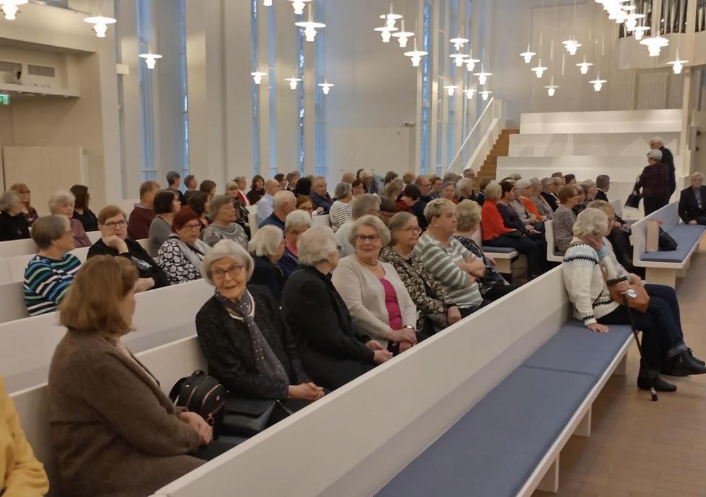 Kahvittelujen jälkeen siirryimme kirkkosalin puolelle nauttimaan Seppo Hovin upeasta esityksestä. Sepon osuuteen oli vapaa pääsy myös ulkopuolisilla. Siksi sali näyttää niin täydeltä, tekoälyä ei ole käytetty yleisömäärän lisäämiseen, kaikki kuvissa näkyvät ihmiset ovat luomua.