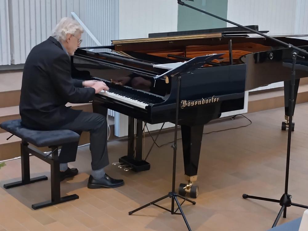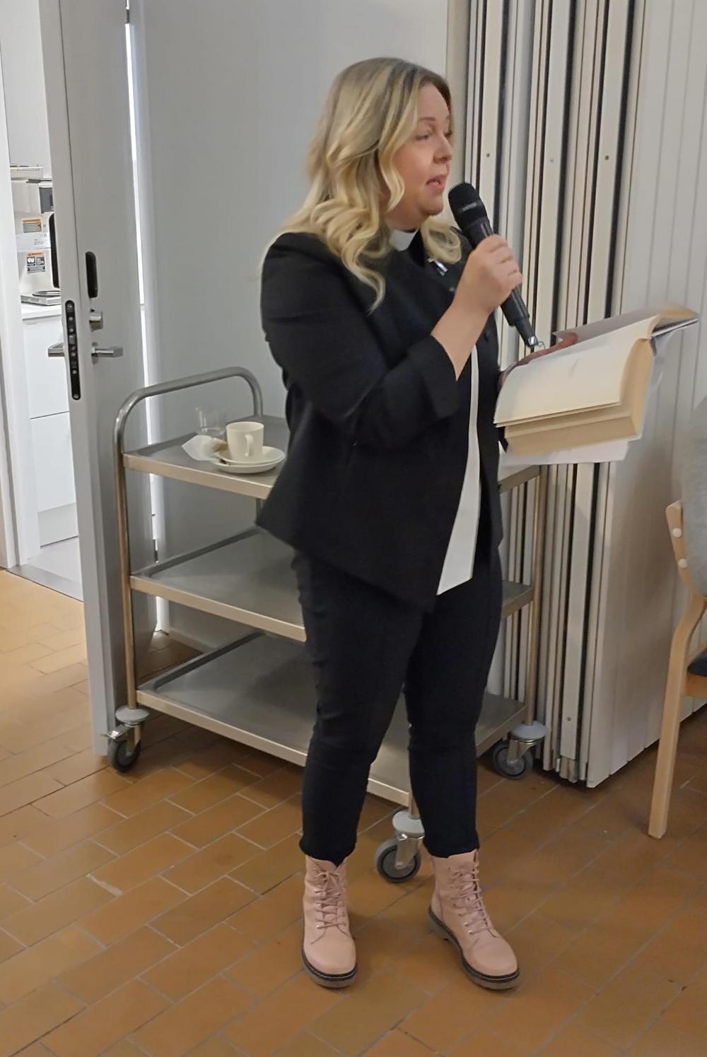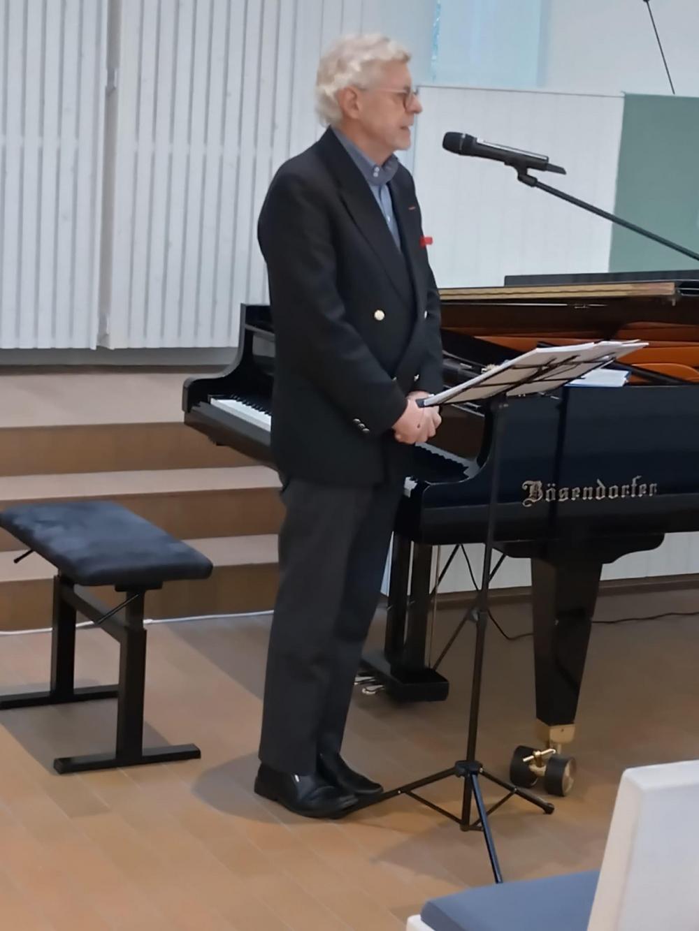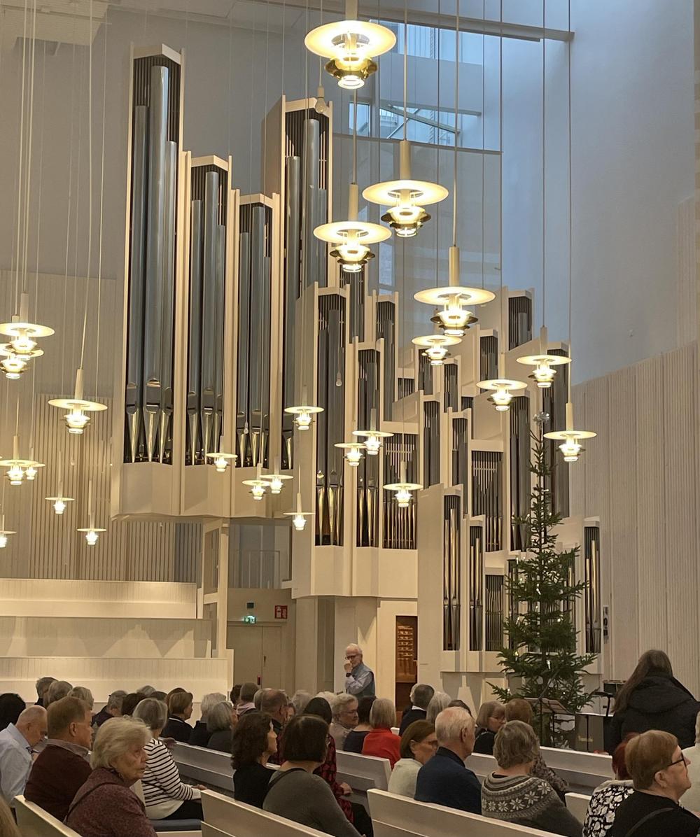 Kahvittelujen jälkeen siirryimme kirkkosalin puolelle nauttimaan Seppo Hovin upeasta esityksestä. Sepon osuuteen oli vapaa pääsy myös ulkopuolisilla. Siksi sali näyttää niin täydeltä, tekoälyä ei ole käytetty yleisömäärän lisäämiseen, kaikki kuvissa näkyvät ihmiset ovat luomua.