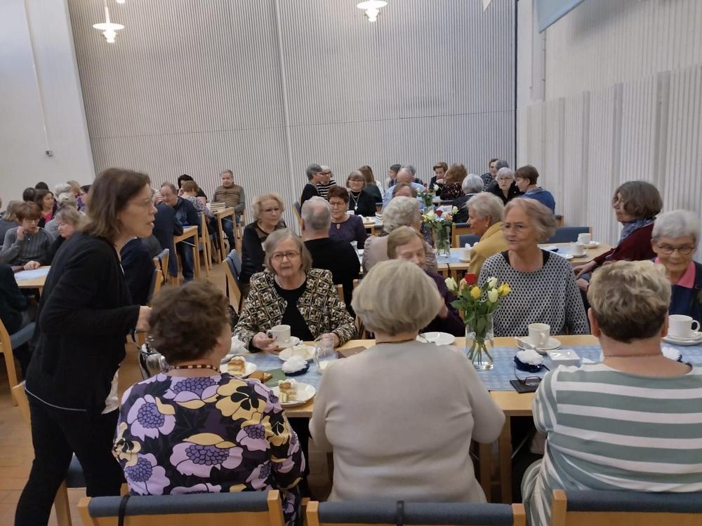 Tämä viikko on meillä yhtä juhlaa. Tänään kokoonnuimme Myyrmäen kirkolle juhlimaan tänä vuonna syntymäpäiväänsä 75, 80, 85 ja 90 vuotta viettäneitä/viettäviä jäseniämme. Tupa oli täpötäynnä ja tunnelma katossa yli 90 jäsenen osallistuessa kahvitteluihin.