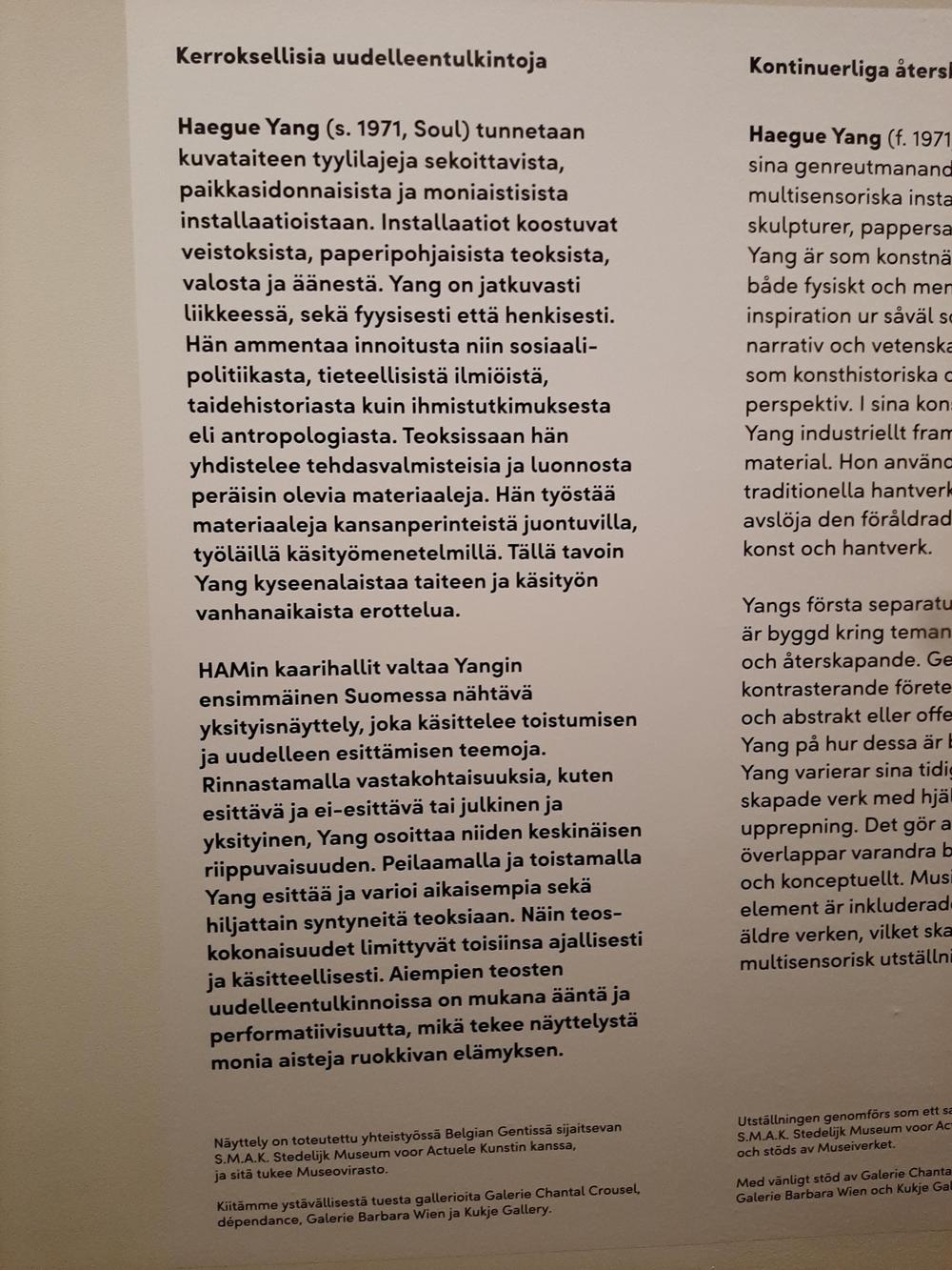 Museokerho järjesti 20.2.2024 käynnin HAMiin Haegue Yanin näyttelyyn Kerroksellisia uudelleentulkintoja. Meitä oli 20 jäsentä tutustumassa oppaan johdolla eteläkorealaisen nykytaiteilijan teoksiin. Mielenkiintoinen näyttely.