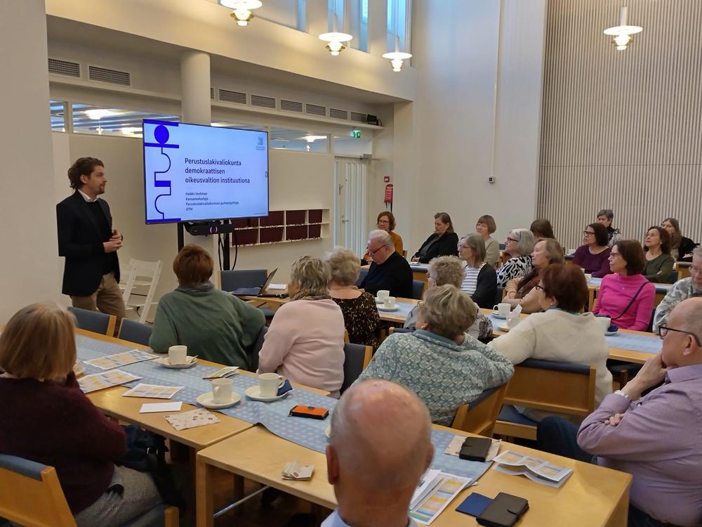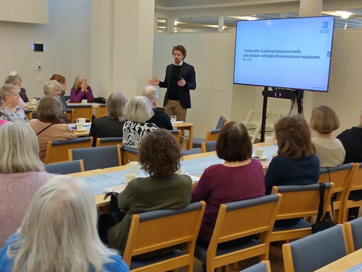 Tänään saimme rautaisannoksen tietoa Perustuslakivaliokunnasta ja sen toiminnasta kun saimme valiokunnan puheenjohtajan Heikki Vestmanin valistamaan meitä. Ei olisi uskonut että meille puhui juristi ja poliitikko, kyllä osasi Heikki hienosti asiansa esittää. Suurkiitokset hänelle vierailusta.